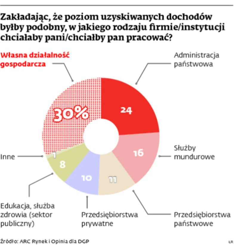Pytanie, jakie w naszym imieniu zadał Polakom instytut badawczy ARC Rynek i Opinia, było proste: w jakiego rodzaju firmie bądź instytucji chcieliby państwo pracować, zakładając, że poziom uzyskiwanych dochodów byłby podobny. Na pierwszy rzut oka wynik wyglądał obiecująco – największy odsetek, bo 30 proc. ankietowanych odpowiedziało, że chciałoby prowadzić własną działalność gospodarczą. Gdy jednak zsumowaliśmy wszystkie rodzaje firm i instytucji wymienionych w ankiecie, okazało się, że w całym sektorze prywatnym chciałoby pracować 42 proc. ankietowanych, czyli ok. 3,5 mln wszystkich zatrudnionych. Reszta, czyli około 5 mln pracujących, woli zajęcie w sektorze publicznym.