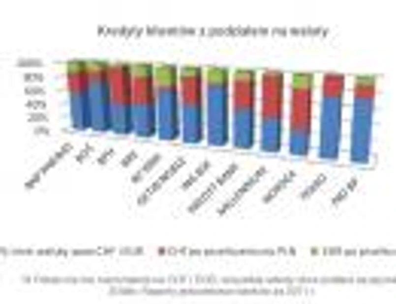 Kolejne banki pod względem udziału walut w kredytach to Kredyt Bank, Getin Noble Bank oraz BNP Paribas. Tu waluty stanowiły na koniec 2011 roku w od 44 do 47 proc. puli kredytów. W BZ WBK była to jedna trzecia, a w PKO BP oraz Pekao ok. 22 proc. Najmniejszym udziałem walut w portfelu kredytowym w granicach 20 proc. mogą się pochwalić ING Bank Śląski i BGŻ.