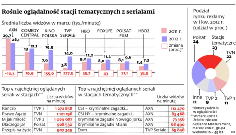 Jak na razie najwięcej z tego budżetu trafia do TVP, Polsatu i TVN. Dzięki takim produkcjom, jak „M jak miłość”, „Szpilki na Giewoncie” czy „Przepis na życie” mają większy udział w rynku niż konkurenci. Ale od dawna ma on tendencję spadkową. Na koniec I kw. 2012 r. ich udział zmniejszył się z 62 do 58,5 proc. – wynika z danych firmy Nielsen Audience Measurement. Widzowie odpłynęli do kanałów tematycznych, by tam oglądać... również seriale.