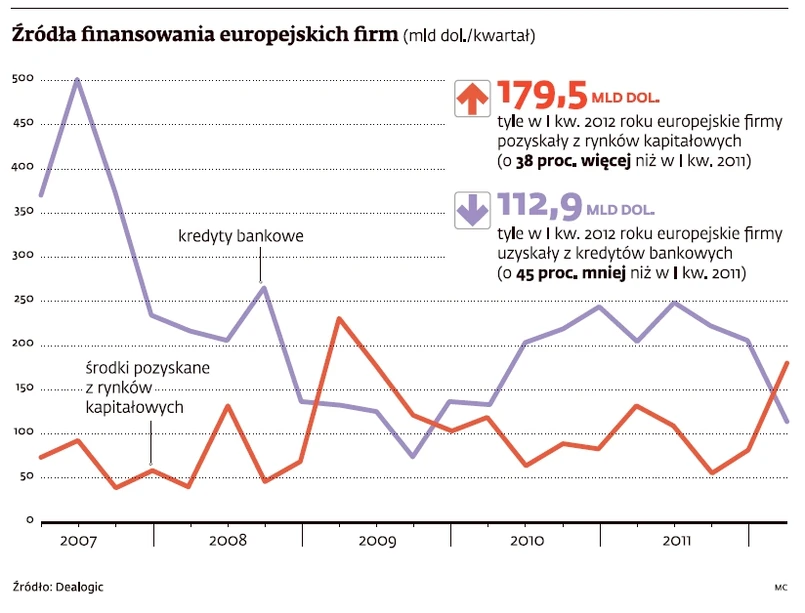 Jak podaje firma analityczna Dealogic w I kwartale tego roku firmy w Unii Europejskiej pozyskały na rynkach 179,5 mld dol., o 38 proc. więcej niż w pierwszych trzech miesiącach poprzedniego roku. Jednak w tym samym czasie aż o 45 proc. (do 112,9 mld dol.) spadła liczba kredytów zaciąganych przez unijne firmy w bankach.