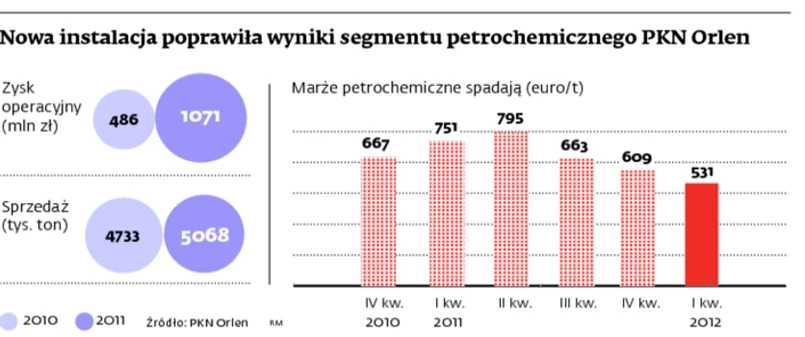 PX/PTA to jedna z najdroższych inwestycji Orlenu. Instalacja, która kosztowała miliard euro, może produkować rocznie milion ton paraksylenu i kwasu tereftalowego, służących do wytwarzania granulatu wykorzystywanego w przemyśle tworzyw sztucznych, głównie przy produkcji butelek, opakowań i folii. PX/PTA ma też istotnie poprawić wyniki koncernu. Dzięki instalacji w 2011 r. Orlenowi udało się poprawić zysk operacyjny segmentu petrochemicznego o 120 proc. I to pomimo nie najlepszej sytuacji na rynku petrochemikaliów. Niższe marże rekompensowały płockiej spółce wysokie notowania paraksylenu oraz wzrost sprzedaży PTA i tworzyw sztucznych. Orlen liczy, że dzięki kompleksowi PX/PTA w przyszłości jego zysk operacyjny skoczy o 400 mln zł rocznie.
