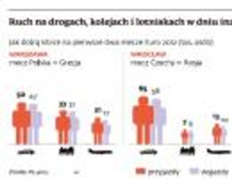 Do stolicy z tej okazji ma przyjechać ok. 104 tys. ludzi, z czego 50 tys. autokarami i autami, a do Wrocławia – ok. 85 tys. Większość to Czesi, którzy przyjadą samochodami. Liczby nie są szokujące, jeśli porównamy je z pielgrzymkami Jana Pawła II i Benedykta XVI. Niepotrzebny raban – Histeria w związku z obsługą transportową Euro 2012 jest nieuzasadniona – twierdzi analityk rynku transportowego Adrian Furgalski. – Znacznie większe obciążenia sieć drogowa w Polsce przeżywa podczas weekendowych powrotów. Skupmy się na obsłudze stref kibica i anglojęzycznej informacji na dworcach PKP, a nie przejezdności autostrad w budowie – apeluje.