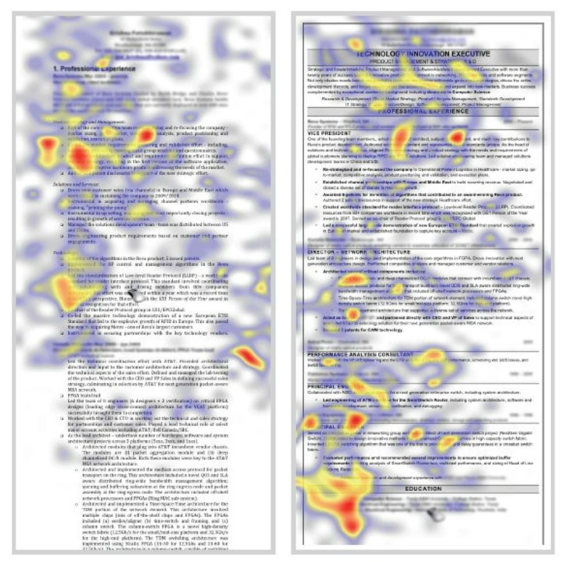 Na zdjęciach prezentujemy dodatkowo wyniki przeprowadzonego przez TheLadders pomiaru ruchu oczu pracodawców. Mapy te pokazują, na których miejscach w CV ich wzrok skupiał się najdłużej.