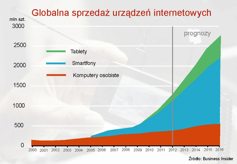 W 2011 r. po raz pierwszy sprzedano więcej urządzeń mobilnych niż tradycyjnych komputerów. Przeciętny Amerykanin na tablety i smartfony poświęca 23 proc. czasu przeznaczonego na media, czyli więcej niż na konwencjonalny internet. A to dopiero początek. Business Insider przewiduje, że w 2016 r. na świecie sprzedane zostanie ponad 1,5 mld smartfonów.