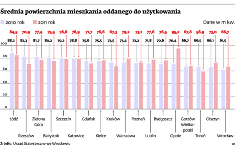 W pozostałych największych miastach powierzchnia mieszkań oddawanych do użytku w 2011 r. wzrosła. Największym zaskoczeniem okazało się Opole, gdzie nowe „cztery kąty” mają powierzchnię, której nie powstydziłyby się apartamenty na Manhattanie. Ubiegłoroczna średnia wyniosła 95,2 mkw. i była aż o 25 mkw. wyższa niż w roku 2010. Eksperci tłumaczą to m.in. niewielką liczbą mieszkań oddanych do użytku w tym mieście (tylko 409 – najmniej wśród miast wojewódzkich). Przy takiej skali budownictwa nawet drobna liczba dużych inwestycji, zwłaszcza budynków indywidualnych, może wysoko podnieść średnią. A ta zwiększyła się także w przypadku Warszawy – z 73,4 mkw. do 79,2 mkw. Tu jednak przyczyna wzrostu jest zupełnie inna.