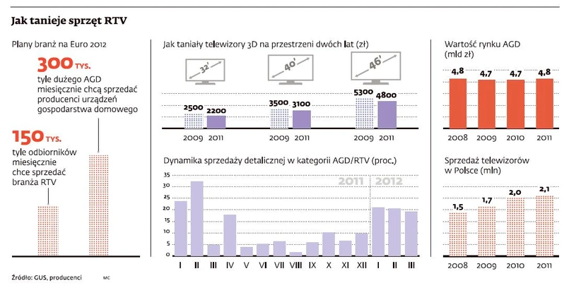 Producenci postawili też na produkcję tanich telewizorów o dużych ekranach. 60-calową plazmę, której sugerowana cena to ok. 5,5 tys. zł, będzie można kupić przed Euro za niepełne 5 tys. zł. Jeszcze rok temu takie telewizory kosztowały powyżej 10 tys. zł, ale te modele nie są naszpikowane wymyślnymi funkcjami.
