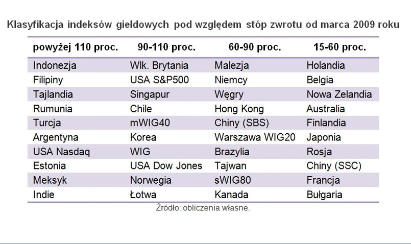W analizie całej czterdziestki indeksów, warto zwrócić uwagę na co najmniej dwa charakterystyczne zjawiska. Po pierwsze widoczne jest ogromne zróżnicowanie w ramach bardzo modnej grupy rynków określanych skrótem BRIC. Tylko Indie plasują się w pierwszej dziesiątce giełd przodujących pod względem stopy zwrotu. Brazylia mieści się w trzeciej, a Rosja i Chiny zamykają stawkę z bardzo skromnymi efektami. Po drugie, narzekania na słabość warszawskiego parkietu, uzasadnione w krótszym, kilkumiesięcznym horyzoncie, nie mają racji bytu w nieco dłuższej perspektywie.