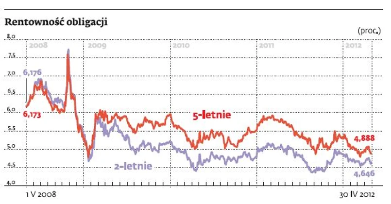 – Poza tym spadają rentowności niemieckich obligacji, które dla naszych są punktem odniesienia. Skoro wiec w Polsce nic złego się nie dzieje, to ten spread nie powinien się rozszerzać i rentowności długoterminowych polskich papierów tez powinny spadać – mówi Arkadiusz Urbański. Jego zdaniem jest dużą szansa, ze gdy rynek wróci do zwykłego rytmu, rentowności pięcioletnich papierów powinny zbliżyć się do marcowych, rekordowo niskich poziomów – 4,75 proc. Podobnie z papierami 10-letnimi – pułap 5,30 proc. z marca tez jest w zasięgu. Zagadka to zachowanie obligacji dwuletnich.