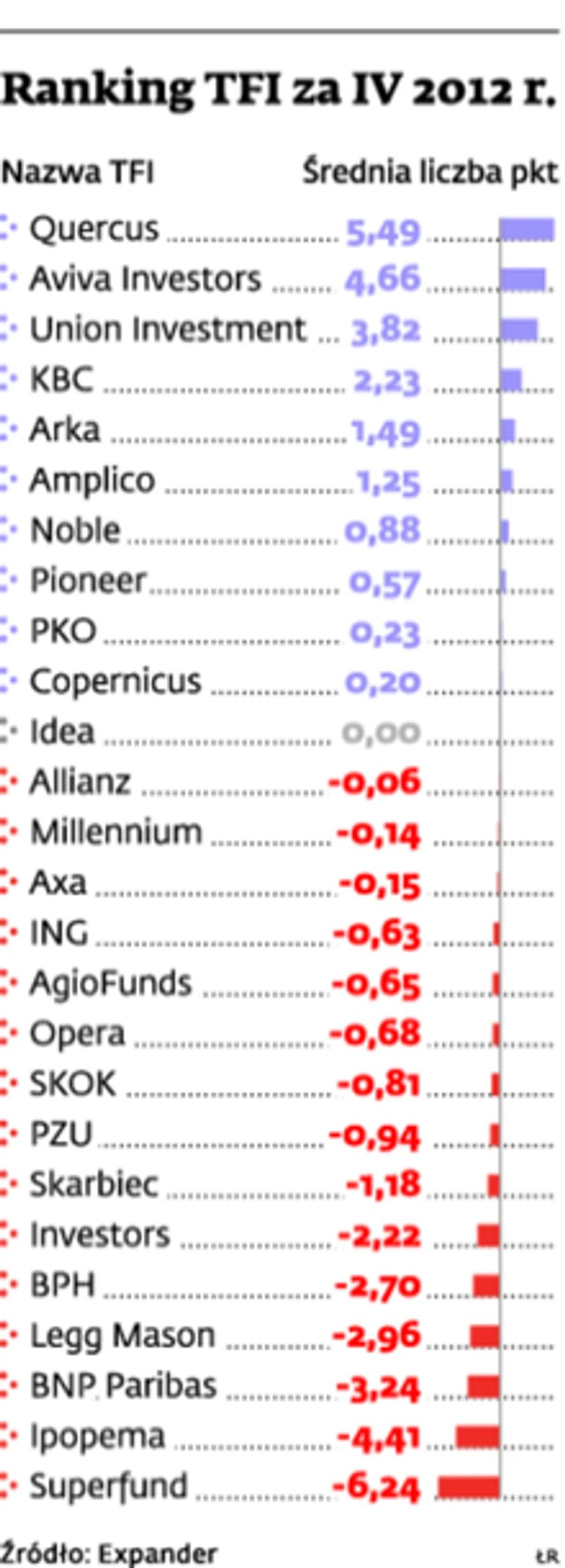 Ranking TFI przygotowywany przez Expandera po raz drugi z rzędu wygrało Quercus TFI. Fundusze tej firmy okazały się najlepsze w trzech punktowanych kategoriach (absolutnej stopy zwrotu, akcji polskich, ochrony kapitału) spośród piętnastu. Na drugiej pozycji uplasowało się Aviva Investors TFI. Te dwie firmy utrzymują się w czołówce już od kilku miesięcy. Trzecią pozycję zajęło tym razem Union Investment TFI (triumfowało w kategoriach: fundusze stabilnego wzrostu krajowe, dłużne krajowe, pieniężne i gotówkowe). Trzecie w poprzednim rankingu Idea TFI spadło na jedenastą pozycję na skutek pogorszenia się wyników funduszy bezpiecznych w związku z bankructwem spółki DSS.
