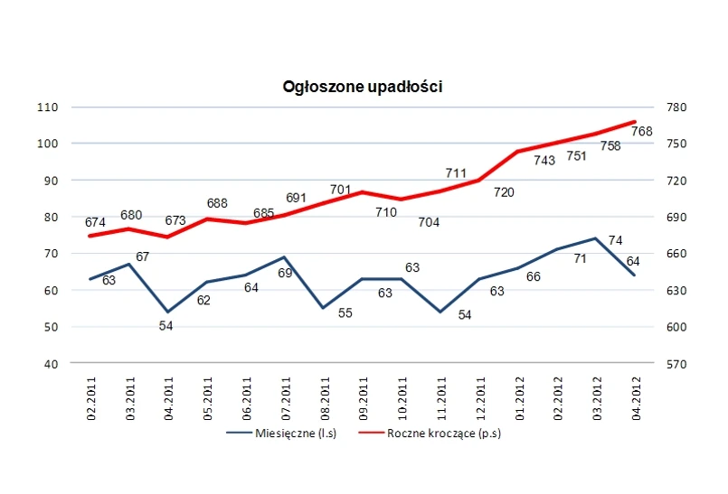 W ciągu ostatnich dwunastu miesięcy na skutek niewypłacalności, działalność gospodarczą zakończyło 768 przedsiębiorstw. Suma upadłości z ostatnich dwunastu miesięcy po kwietniu okazała się o 1,3 proc. wyższa od zanotowanej po marcu (758).