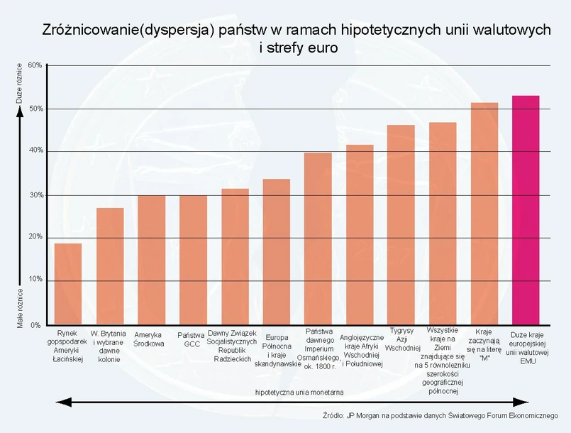 Okazało się, że losowy dobór członków unii walutowej może mieć większe szanse powodzenia niż wielki europejski projekt. Nawet wszystkie państwa o nazwach zaczynających się (w jęz. angielskim) na literę „M” odznaczają się mniejsza wewnętrzną różnorodnością od strefy euro. Jeszcze lepiej prezentują się kraje leżące wzdłuż piątego równoleżnika szerokości północnej.