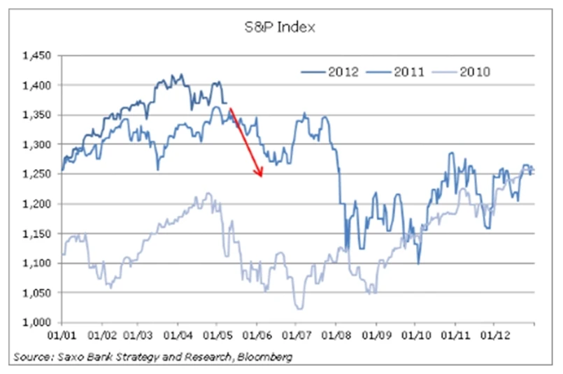 W prognozie Saxo Bank na drugi kwartał 2012 roku wspominaliśmy o możliwości powtórzenia się w pierwszym półroczu sytuacji z roku ubiegłego. A to za sprawą korygowanych w dół prognoz gospodarczych oraz nieuchronnej korekty kursu ropy Brent w kierunku 115 dolarów. Wykresy wyraźnie pokazują, że powtórka korekty jest dość prawdopodobna, zarówno na S&P jak i na rynkach towarowych.