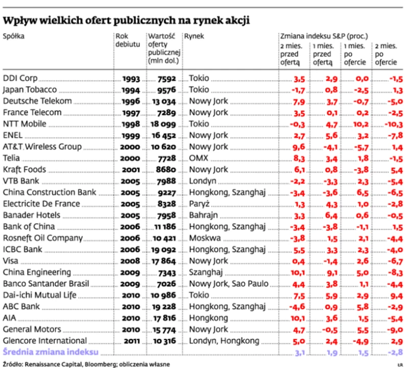 Historia pokazuje, że debiuty giełdowe poprzedzane wielkimi ofertami publicznymi sprzyjają wzrostom, ale tylko do momentu pojawienia się akcji wielkiej firmy na giełdzie. Na 24 największe oferty publiczne w ostatnich dwudziestu latach tylko w pięciu przypadkach po dwóch miesiącach od głośnego debiutu szeroki rynek (pod uwagę wzięliśmy notowania indeksu Standard & Poor’s 500) notował jakiekolwiek zwyżki.