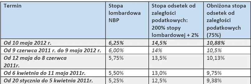 Zgodnie z decyzją RPP, stopa lombardowa wzrasta od 10 maja 2012 r. z 6,00% do 6,25%. A to oznacza, że stopa odsetek od zaległości podatkowych będzie wynosiła 14,5% (obecnie odsetki za zwłokę kosztują podatników 14% w skali roku).