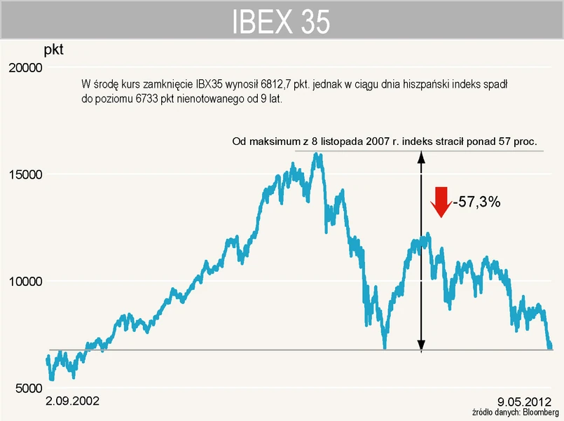 Indeks IBEX 35 spadł w ciągu wczorajszego dnia o 2,78 proc. do poziomu 6, 812 pkt. na zamknięciu, czyli jeszcze niżej niż notowania indeksu z początku kryzysu finansowego w 2009 roku.