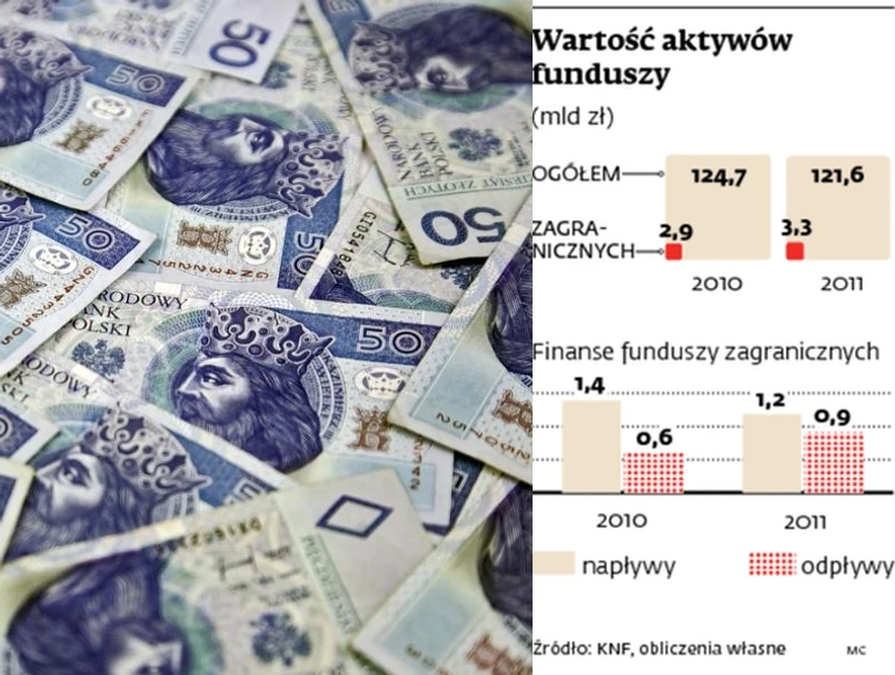 Fundusze zagraniczne zanotowały w 2011 r. dodatnie saldo wpłat i wypłat. Sięgnęło ono 281 mln zł, dzięki czemu zwiększyły swój udział w rynku z 2,3 proc. do 2,7 proc. Napłynęło do nich 1,2 mld zł, o 14 proc. mniej niż w 2010 r. Klienci wypłacili z nich 0,9 mld zł, o 50 proc. więcej niż w poprzednim roku. Krajowe fundusze miały w 2011 r. ujemne saldo sięgające 3,3 mld zł.