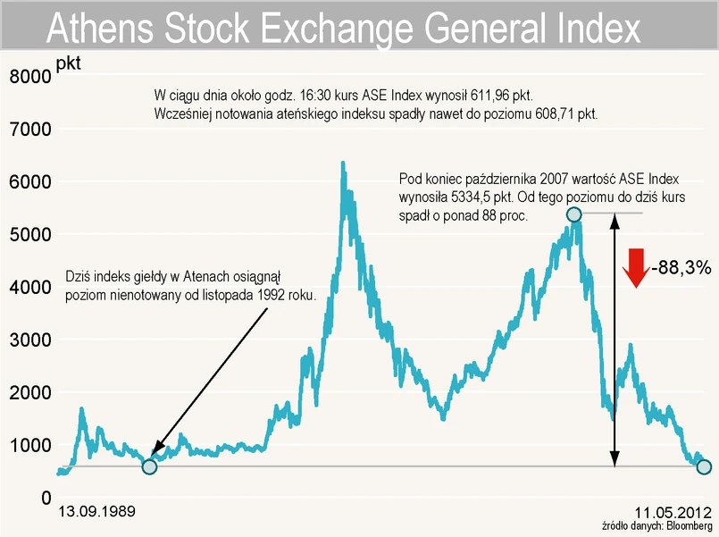 Indeks ASE osiągnął podczas dzisiejszej sesji rekordowo niski poziom 608,71 pkt. Tak złych notowań indeks nie miał listopada 1992 roku, gdy na zamknięciu 27 listopada 1992 roku osiągnął poziom 594,93 pkt. Spadek do rekordowych poziomów na greckich parkietach to efekt chaosu politycznego, bowiem od tego, czy uda utworzyć proreformatorski rządu w kraju, zależy wypłacenie pomocy finansowej od UE i MFW. To z kolei będzie miało kluczowy wpływ na to, czy Grecja będzie zmuszona ogłosić bankructwo.