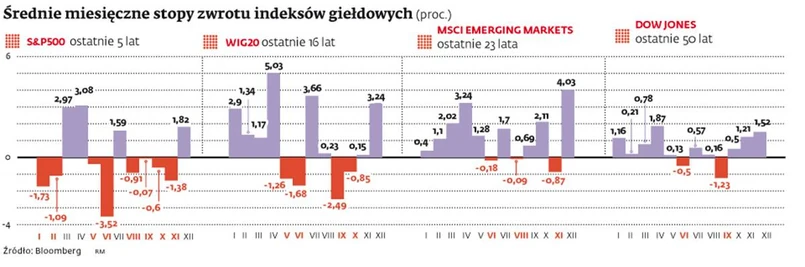 Zestawienie średnich miesięcznych stóp zwrotu różnych indeksów z różnych okresów pokazuje, że pierwsze cztery miesiące roku rzadko przynoszą straty. Zawsze na czerwono kończą się notowania czerwcowe, często słabe bywają miesiące wakacyjne i wrzesień. Jeśli chodzi WIG20, maj, czerwiec, wrzesień i październik mają ujemne średnie miesięczne stopy zwrotu z ostatnich 16 lat.