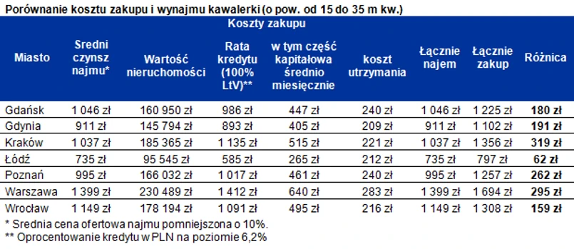Decydując się na zakup mieszkania na kredyt trzeba liczyć się nie tylko z koniecznością opłacania comiesięcznych rat, ale też utrzymania posiadanej nieruchomości (w analizie uwzględniliśmy czynsz na rzecz spółdzielni lub wspólnoty mieszkaniowej, a pominęliśmy koszt zakupu energii elektrycznej). W takim ujęciu łączny koszt zakupu i utrzymania kawalerki o wartości 230 tys. zł (przeciętna cena transakcyjna w ostatnich 12 miesiącach) w Warszawie można oszacować na 1690 zł miesięcznie, o ile finansowanie zakupu pochodziłoby w 100% z kredytu. Dla porównania za najem podobnej nieruchomości trzeba zapłacić około 1400 zł miesięcznie. Różnicę w koszcie zakupu i wynajęcia nieruchomości można więc oszacować na około 290 zł miesięcznie. Nie jest to wynik najwyższy. W Krakowie kupując przeciętną kawalerkę trzeba liczyć się z miesięcznym kosztem o około 320 zł wyższym niż gdyby wybrało się najem. Na drugim biegunie znajduje się Łódź. Za sprawą relatywnie niskich kosztów zarówno zakupu jak i najmu nowo upieczony właściciel musi się liczyć z miesięcznym kosztem o 60 zł wyższym niż gdyby wybrał najem.