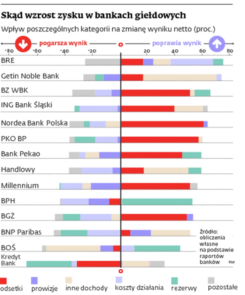 Dla dużej grupy banków głównym źródłem poprawy wyników był wzrost wyniku odsetkowego. Poprawianie sobie wyników przez instytucje finansowe jest możliwe przy zmianie stóp procentowych – RPP je podnosi, a banki wstrzymują się przez pewien czas z podwyżkami oprocentowania depozytów, a jednocześnie niemal automatycznie rosną odsetki od kredytów. To pozwala na zwiększanie dochodów nawet bez powiększania portfela kredytowego.