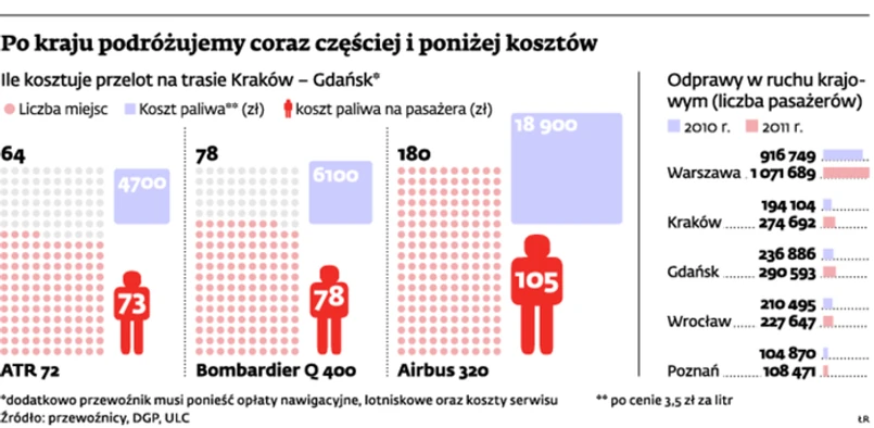 Wątpliwości budzą przede wszystkim ceny biletów, które nie są w stanie pokryć kosztów przewoźników. Nawet w przypadku małych samolotów typu ATR ceny zaczynające się od 99 zł wystarczą co najwyżej na paliwo. To co prawda znaczący, ale niejedyny koszt działalności linii. Do ceny paliwa należy bowiem doliczyć opłaty na lotniskach dla wszelkich służb serwisowych oraz opłaty za przeloty, starty i lądowania odprowadzane do Polskiej Agencji Żeglugi Powietrznej. Kosztują też pracownicy. Lekką ręką należy więc zamknąć koszt półtoragodzinnego lotu z Krakowa do Gdańska kwotą 30 – 35 tys. zł.