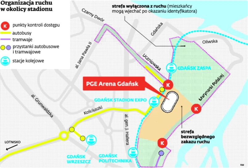 Również na cztery godziny przed meczem w sąsiedztwie stadionu powstanie strefa bezwzględnego zakazu ruchu samochodowego, do której dostać się będą mogły tylko pojazdy akredytowane przez UEFA. Mowa o obszarze objętym ulicami: Uczniowską, Marynarki Polskiej, Reja i torami kolejowymi.