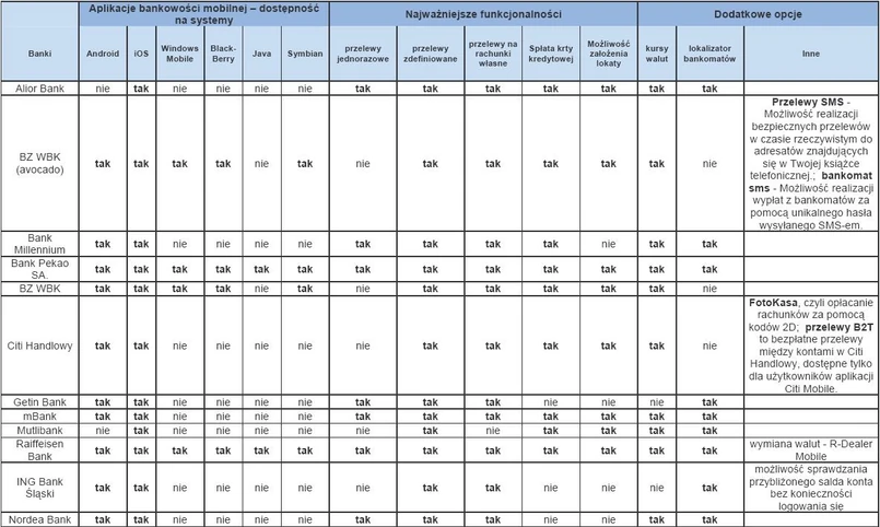 Tylko Raiffeisen Bank i Pekao SA oferują swoje aplikacje na wszystkie na wszystkie powszechne systemy operacyjne: Android, Symbian, Windows Mobile, iOS, Java, BlackBerry. O ile brak dostępności aplikacji pod BlackBerry da się zrozumieć, urządzenia te są w naszym kraju stosunkowo mało popularne, to zastanawiający jest brak dostępności aplikacji od Aliora (tylko iOS) czy MultiBanku pod Androida – najpowszechniejszy system operacyjny w Polsce. Jeśli banki chcą zdziałać tutaj więcej powinny się poważnie zastanowić nad wypuszczeniem wersji także pod inne systemy, chociażby Symbiana.