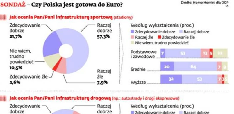 Najgorzej wypadły drogi. Aż 79 proc. respondentów uważa, że rządowi nie udało się wybudować obiecanych połączeń, a kibiców, którzy przyjadą samochodami, czeka komunikacyjny horror. Będą musieli pokonać ok. 150 przewężeń będących efektem nieskończonych prac na drogach. Bardziej krytyczni byli mężczyźni: 82 proc. uznało, że