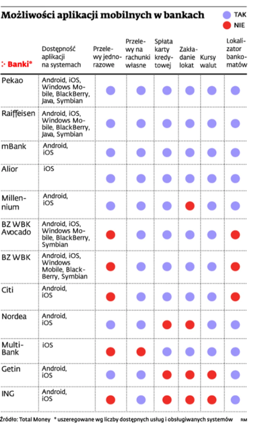 Z usług mobilnych korzysta jednak dziś tylko 3,5 proc. klientów banków. Analitycy Total Money tłumaczą, że jednym z powodów jest wciąż niskie nasycenie polskiego rynku smartfonami, umożliwiającymi instalację aplikacji. W raporcie na temat mobilnych banków zwracają także uwagę, że wciąż dwie instytucje: Alior i MultiBank, swoje rozwiązanie kierują wyłącznie do posiadaczy iPhone’ów. Tylko Raiffeisen i Bank Pekao oferują aplikacje działające pod większością dostępnych systemów operacyjnych. Zdaniem Total Money banki powinny inwestować w rozwój aplikacji, by współpracowały np. z systemem Symbian, instalowanym w starszych modelach Nokii.