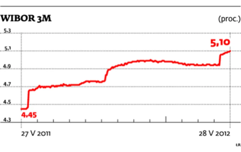 Dziś trzymiesięczny WIBOR – punkt odniesienia do ustalania oprocentowania dla większości kredytów – wynosi 5,10 proc. I w kolejnych miesiącach nie powinien już wyraźnie rosnąć. Pokazują to notowania kontraktów FRA – umów zawieranych między inwestorami, w których próbują oni określić, jak będą kształtować się stopy procentowe za kilka miesięcy. Z ich analizy wynika, że trzymiesięczny WIBOR utrzyma się na obecnym poziomie co najmniej przez pół roku. A później zacznie spadać. W lutym przyszłego roku powinien wynieść 4,91 proc., a po kolejnych kilku miesiącach spaść do 4,71 proc.