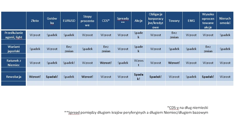 Politycy będą mieli trochę czasu na podjęcie niezbędnych reform; zmniejszenie deficytów fiskalnych można będzie rozłożyć na dłuższy, bardziej realistyczny okres. Scenariusz ten jest znacznie lepszy dla ryzykownych aktywów (jednak uwaga na ryzyko walutowe) – jeśli chodzi o instrumenty rynku kasowego, najlepiej trzymać 50 proc. aktywów w akcjach (być może z większym naciskiem na akcje solidnych emitentów z krajów peryferyjnych, którym nie grozi wyrzucenie ze strefy euro, a w których akcje już teraz najbardziej potaniały), 25 proc. w korporacyjnych instrumentach kredytowych i 25 proc. w obligacjach hiszpańskich oraz włoskich. Jeśli chodzi o rynek walutowych, koniecznie trzeba by otworzyć krótką pozycję w parze EURUSD. W tym scenariuszu nadal wiele zostałoby do zrobienia (przy wciąż grożącym Europie ryzyku, że po początkowej poprawie nastrojów wrócimy do scenariusza „dalszego przedłużania agonii”), natomiast w krótkim okresie poświęcenie byłoby najmniejsze.