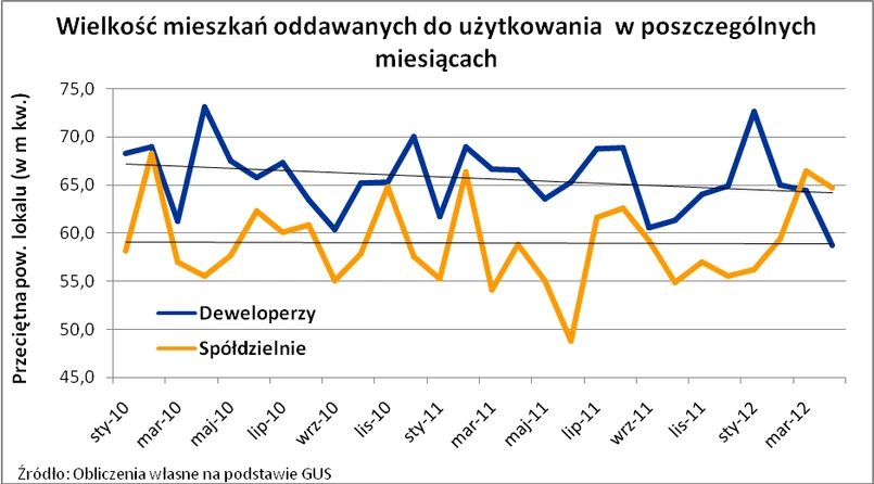 Znacznie bardziej interesujące są informacje o wielkości nieruchomości budowanych przez indywidualnych inwestorów i deweloperów. W przypadku tych drugich od 2006 roku hossa na rynku spowodowała powiększanie się mieszkań oddawanych do użytkowania. Podczas gdy na początku 2006 roku miały one niecałe 63 m kw., to już w pięć lat później przeciętna powierzchnia przekraczała 68 metrów. Dopiero od początku 2009 roku widoczny jest spadek przeciętnych powierzchni mieszkań oddanych do użytkowania. Od tego czasu przeciętna wielkość mieszkania oddawanego do użytkowania przez dewelopera zmniejszyła się o 3,7 metra.