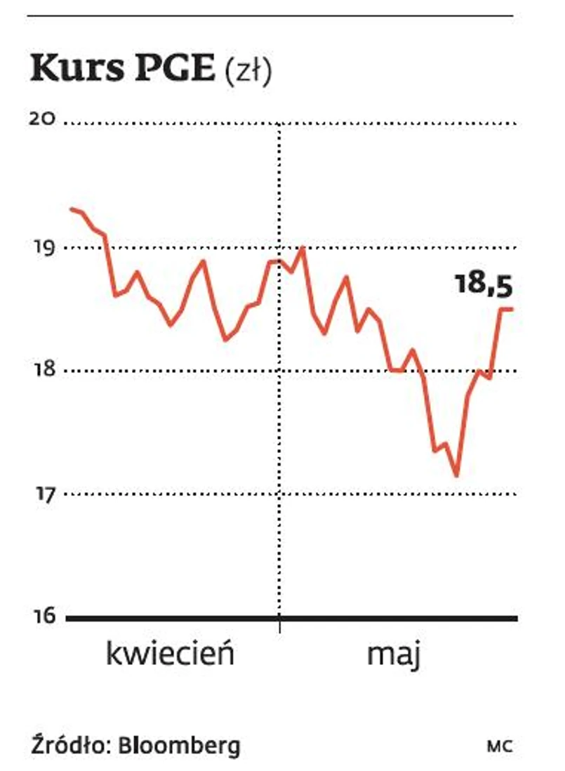 Na razie jednak akcjonariusze PGE mogą się cieszyć. Ubiegłotygodniowy wzrost wartości papierów tej grupy energetycznej to w dużej części zasługa decyzji walnego zgromadzenia akcjonariuszy, które postąpiło wbrew rekomendacji zarządu i zwiększyło dywidendę z proponowanych 1,32 zł do 1,83 zł na akcję. Łącznie spółka przeznaczy na ten cel ponad 3,4 mld zł. Na zakończenie piątkowej sesji za jeden papier PGE płacono 18,5 zł. Zdaniem analityków udziałowcy spółki mają jednak szansę na dalsze zyski. W ostatniej rekomendacji przygotowanej pod koniec kwietnia specjaliści z DM PKO BP wyliczyli, że jedna akcja PGE warta jest 20,60 zł.