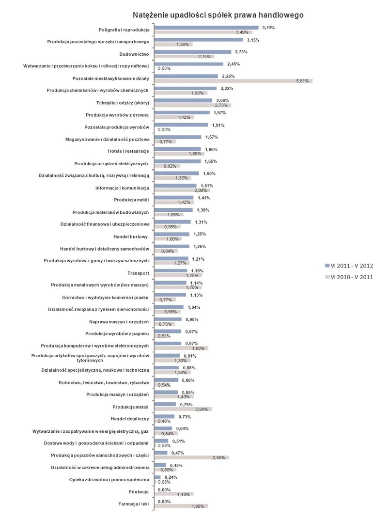"Suma upadłości z ostatnich dwunastu miesięcy po maju okazała się o 2,6 proc. wyższa od zanotowanej po kwietniu (768). Przed rokiem, tj. w maju 2011 r., roczna krocząca suma upadłości wynosiła 688 firm. Wynik bieżący jest więc o 14,5 proc. gorszy. W ostatnich dwunastu miesiącach najmniejszą liczbę upadłości w pojedynczym miesiącu ogłoszono w listopadzie (54 firmy), natomiast w maju tego roku upadło najwięcej przedsiębiorstw, bo aż 82" - napisano.