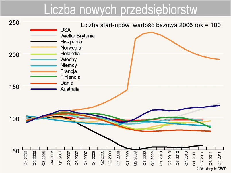 Również Australia i Wielka Brytania odnotowały mocny wzrost w kreowaniu nowych przedsiębiorstw pod koniec 2011 roku – obecnie otwiera się tam więcej firm niż przed kryzysem. Oprócz Norwegi, gdzie wskaźnik ten zachowuje się stabilnie, w pozostałych badanych krajach OECD mimo odbicia wciąż nie osiągnął poziomu sprzed kryzysu. Niestety, w raporcie nie uwzględniono danych z Polski.