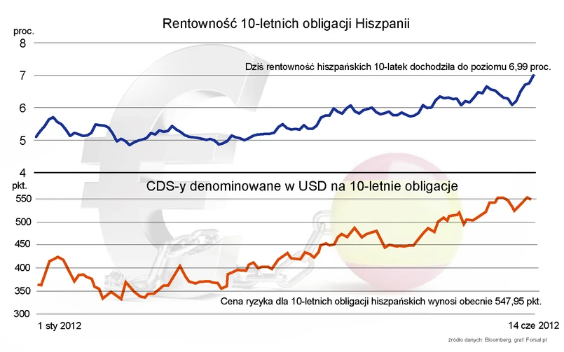 Z powodu obaw o stan hiszpańskiej gospodarki różnica w oprocentowaniu hiszpańskich 10-latek i niemieckich bundów o tym samym okresie zapadalności poszerzyła się do 542 pkt bazowych. Jeszcze rok temu różnica ta wynosiła 245 pkt bazowych. Spread między rentownością włoskich i niemieckich papierów sięga obecnie 478 pkt bazowych. Rok temu wynosił 175 pkt bazowych.