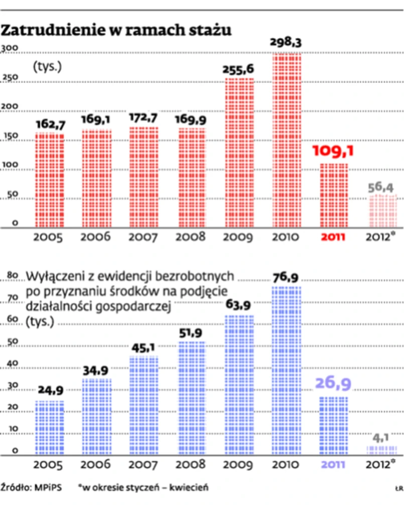 Urzędy mogłyby zostać dodatkowo zasilone pieniędzmi na staże. W Funduszu Pracy, który służy finansowaniu różnych metod walki z bezrobociem, jest już ponad 5 mld zł. Część z nich mogłaby być przeznaczona na aktywizację zarejestrowanych obecnie ponad 2 mln bezrobotnych, w tym prawie 411 tys. w wieku do 24 lat. Decyzja zależy od ministrów pracy i finansów.