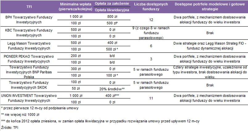 W przypadku IKZE prowadzonych przez TFI, w zależności od towarzystwa, środki wpłacane na konto emerytalne mogą trafić do kilku bądź kilkunastu subfunduszy (zazwyczaj prowadzonych w ramach jednego funduszu parasolowego). Towarzystwa dają też zazwyczaj możliwość inwestowania za pomocą tzw. portfeli modelowych. Jest to gotowa strategia inwestycyjna, uzależniona m.in. od długości okresu oszczędzania. W przypadku skorzystania z takiej strategii, klient wpłaca środki na określone konto, a towarzystwo zarządzające IKZE samo rozlokowuje pieniądze między różne fundusze. Minimalne kwoty pierwszej wpłaty na IKZE prowadzone przez TFI wynoszą od 100 (TFI SKOK) do 1000 zł (BPH TFI). W przypadku kolejnych wpłat wymagane są kwoty od 50 do100 zł. Towarzystwa nie wymagają przy tym deklarowania wysokości comiesięcznych wpłat, ani zebrania konkretnej wysokości środków (poza BPH TFI, które wymaga by w pierwszym roku wpłacić przynajmniej 2000 zł).