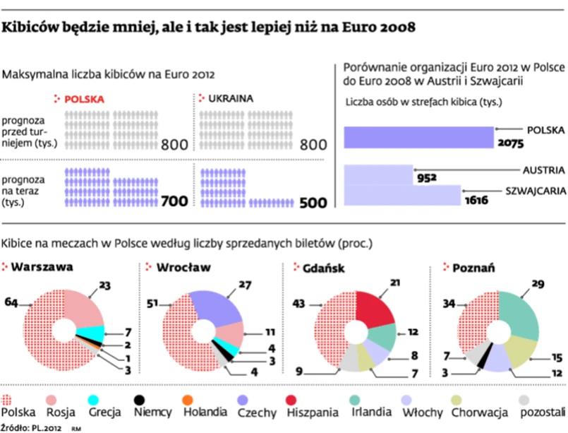 Na samym Stadionie Narodowym mecze śledziło 161 tys. osób, z czego 23 proc. to Rosjanie. W Gdańsku – 117 tys. , w tym 21 proc. Hiszpanów. Niemal tyle samo we Wrocławiu – z czego 27 proc. widowni to Czesi. Z kolei w Poznaniu było 106 tys. kibiców, 29 proc. stanowili Irlandczycy. Do tego dochodzą strefy kibica w Krakowie i miastach gospodarzach, przez które przewinęło się cztery razy więcej osób niż przez wszystkie stadiony – ponad 2 mln. Razem z Ukrainą było ich w sumie prawie 4 mln.