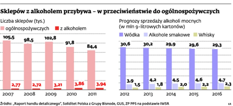 Na koniec 2011 r. w kraju działało 3941 sklepów monopolowych. To aż o 735 więcej niż w 2010 r. Rozwój tego segmentu rynku najczęściej odbywa się kosztem sklepów ogólnospożywczych, w których dział z alkoholami był jednym z wielu. – Rośnie bowiem popyt na lepsze markowe trunki, których nie ma zwykle w osiedlowych marketach – wyjaśnia Leszek Wiwała, prezes Związku Pracodawców Polski Przemysł Spirytusowy (ZPPPS).