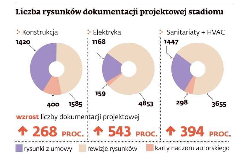 Jak wyliczają firmy, realne koszty budowy stadionu wzrosły o minimum 20 proc. Media już wcześniej donosiły, że zmiany w projektach spowodowały wypłatę przez NCS dodatkowych 130 mln zł podwykonawcom.