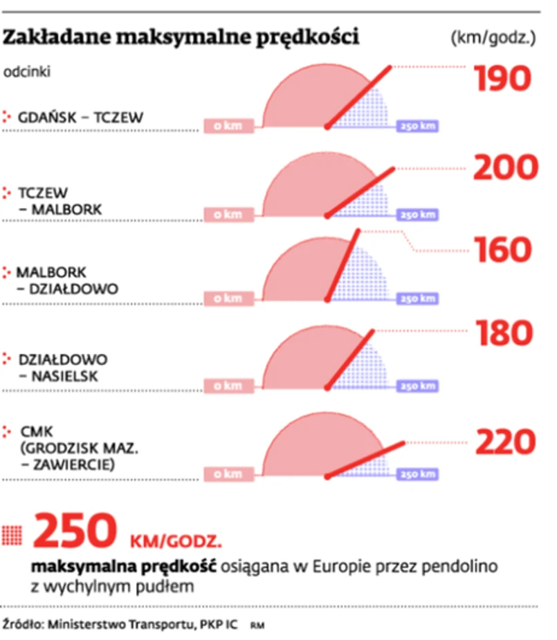 Wątpliwości Brukseli wzbudza m.in. zbyt mała prędkość pociągów. Kolej zadeklarowała, że pendolino będą jeździć do 200 km/godz., ale tylko na południe od stolicy. Maksymalna prędkość między Warszawą i Gdańskiem to przy obecnych przepisach 160 km/godz. Hamulcem jest brak tzw. wychylnego pudła, które ułatwia składom pokonywanie łuków. Wyposażone w taki system pendolino jeżdżą w Europie z prędkością 250 km/godz. Producent nie zaoferował go w przetargu, redukując własne koszty o 8 – 10 proc.