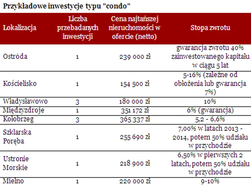 Plusem tego typu inwestycji jest fakt, że inwestor może osiągać z góry określony poziom czynszu. W wielu hotelach typu „condo” jest on gwarantowany wieloletnią umową. W takim wypadku można liczyć na przychody na poziomie od 5 do 10% wartości nieruchomości w skali roku. Na przykład we Władysławowie inwestor płacąc za nieruchomość 180 tys. zł powinien otrzymać od operatora 18 tys. zł rocznie w postaci czynszów. Czas trwania umowy może sięgnąć nawet 20 lat (jest tak np. w wybranych inwestycjach we Władysławowie i Mielnie). Jeśli jednak podpisuje się ją na krótszy okres, na przykład 5 lat, w umowie zawiera się klauzulę zobowiązującą strony do jej przedłużenia. Z odmienną sytuacją można się spotkać w badanych inwestycjach w Jastarni i Ostródzie. W pierwszej z nich inwestor ma gwarancję, że otrzyma przychód na poziomie 24% wartości nieruchomości w ciągu 3 lat, a w drugiej, że otrzyma 40% przez lat 5. Potem zyski właściciela pokoju będą zależne od tego ile hotel faktycznie zarobi.