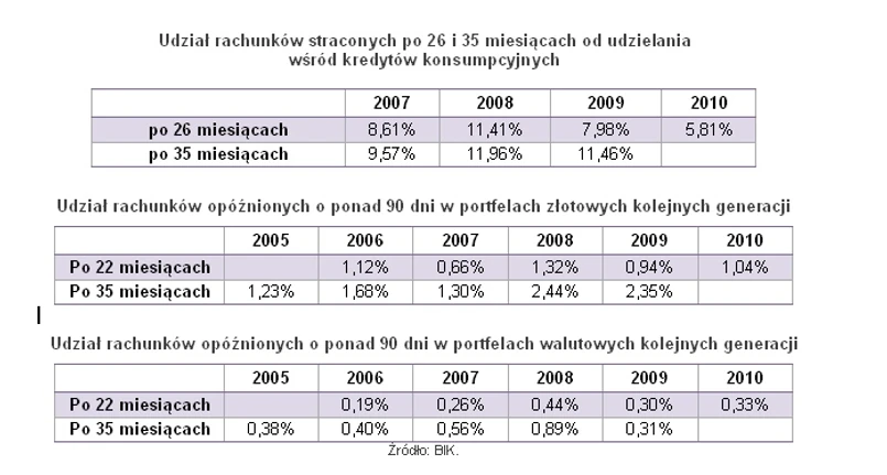 Jak podaje BIK, z kredytów ze stycznia 2010 roku, po 23 miesiącach opóźnienia notował co osiemnasty rachunek; w przypadku kredytów z 2008 roku po takim czasie opóźnienia pojawiały się przy co jedenastym kredycie, a dla kredytów z 2007 roku problem występował w co trzynastym przypadku. Co jednak godne podkreślenia, liberalna polityka kredytowa z 2008 roku w połączeniu z późniejszym kryzysem bardzo nieznacznie wpłynęły na pogorszenie jakości portfeli banków samochodowych – zauważa BIK.