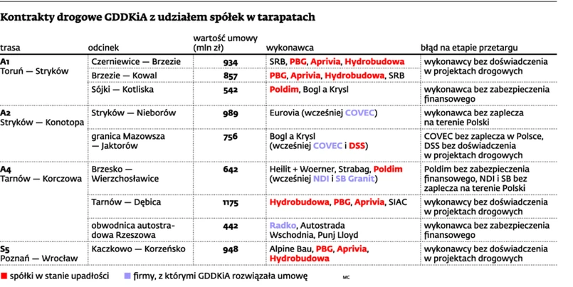 Branża apeluje o zaostrzenie kryteriów. Teoretycznie przed podpisaniem umowy GDDKiA sprawdza potencjał finansowy każdego wykonawcy trzy lata wstecz. Przykładowo jeśli kontrakt ma wartość ponad 1 mld zł, to średnioroczny przychód wykonawcy z ostatnich trzech lat musi osiągnąć minimum 40 proc. jego wartości. Zdarzało się, że firma niewiarygodna w pojedynkę przechodziła przez sito kwalifikacji dzięki doświadczeniu silniejszego partnera.