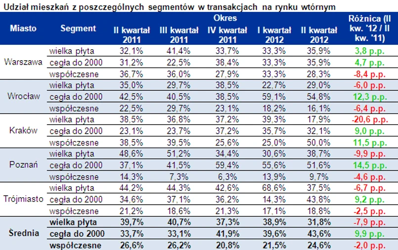 W Warszawie natomiast wzrost popularności kamienic idzie ręka w rękę z wielką płytą. Udział obu tych segmentów rynku w liczbie zawieranych transakcji wynosi po 35,9%. Względem analogicznego okresu przed rokiem progres wyniósł w ich przypadku odpowiednio 4,7 i 3,8 pkt. proc. Wzrost ten odbył się kosztem budownictwa współczesnego odpowiedzialnego w stolicy za ponad 28% transakcji mieszkaniami używanymi.