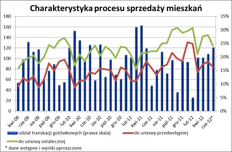 Niespełna trzy miesiące, dokładnie 84 dni, zajmował przeciętnie dla transakcji sfinalizowanych w czerwcu pierwszy etap procesu sprzedaży, liczony od wystawienia oferty na sprzedaż, do podpisania umowy przedwstępnej. Względem czerwca etap ten skrócił się o 10 dni. O tyle też jest krótszy od średniej z ostatnich 12 miesięcy. Jest to więc kolejny pozytywny sygnał, który wymaga potwierdzenia. Radykalne skrócenie procesu sprzedaży na przestrzeni kilku tygodni z dużym prawdopodobieństwem jest bowiem zjawiskiem jednorazowym, tym bardziej, że średnia krocząca z ostatnich 12 miesięcy wskazuje na wydłużanie się pierwszego etapu procesu sprzedaży konsekwentnie od kwietnia 2011 roku. Analogiczną sytuację mamy zresztą w przypadku danych obejmujących cały proces sprzedaży, gdzie średnia z ostatnich 12 miesięcy osiągnęła w czerwcu najwyższy w historii badania poziom 138 dni (4,5 miesiąca). Wynik ten odzwierciedla problemy, z jakimi boryka się rynek wtórny, czyli mała gotowość sprzedających do obniżania cen, a także problemy z uzyskaniem kredytu przez kupujących.