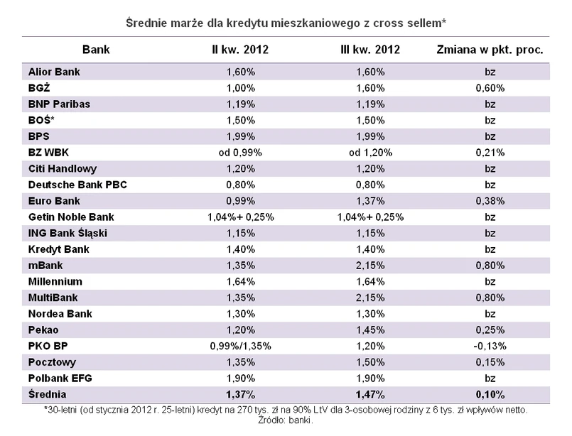 Na najwyższe podwyżki marży latem zdecydowały się mBank i MultiBank. Obecnie zamiast 1,35proc. marży, klient musi się liczyć tam ze stawką 2,15 proc. Mocno w górę poszła też cena kredytu mieszkaniowego w BGŻ - z 1 do 1,6 proc. BZ WBK podniósł stawkę z min. 0,99 proc. do min. 1,2 proc. i obniżył maksymalne LtV ze 100 do 90 proc., w Pekao marża zwiększyła się z 1,2 do 1,45 proc. nadal jednak nie ma prowizji. W Euro Banku zamiast przykuwającego uwagę 0,99 proc. jest 1,37 proc. , a na dodatek nie ma już taryfy ulgowej na prowizję i trzeba zapłacić 1 proc. wartości kredytu. Na podwyżkę postawił też Bank Pocztowy - marża wzrosła z 1,35 do 1,50 proc.