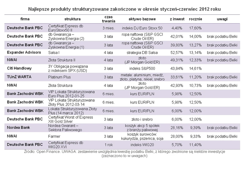 Najwięcej powodów do zadowolenia mają klienci Deutsche Banku PBC, którego trzy inwestycje były trzema najlepszymi zakończonymi w okresie styczeń-czerwiec 2012 r. Dwie z nich trwały trzy lata i powiązane były z ceną ropy naftowej, wynik trzeciej (zakończyła się po trzech miesiącach) zależał od indeksu DJ Euro Stoxx 50. Certyfikat Express db EuroStoxx50 II przyniósł 4,4 proc. w trzy miesiące (17,6 proc. rocznie), db Gwarancja - Zyskowna Energia (2) dała 42,01 proc. (14 proc. rocznie), a db Gwarancja – Zyskowna Energia (1) zarobiła 39,8 proc. (13,27 proc. per annum). Warto przy tym zaznaczyć, że obie db Gwarancje miały formę polisy na życie i dożycie, co oznacza, że od zarobku nie trzeba było płacić podatku Belki.