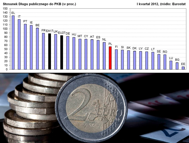 Pod koniec pierwszego kwartału 2012 roku długi unijnej „17” wzrosły do poziomu 88,2 proc. PKB. W czwartym kwartale 2011 roku wynosiły 87,3 proc. PKB. W całej Unii stosunek długu publicznego do PKB wzrósł do 83,4 proc., w poprzednim kwartale wynosił 82,5 proc.